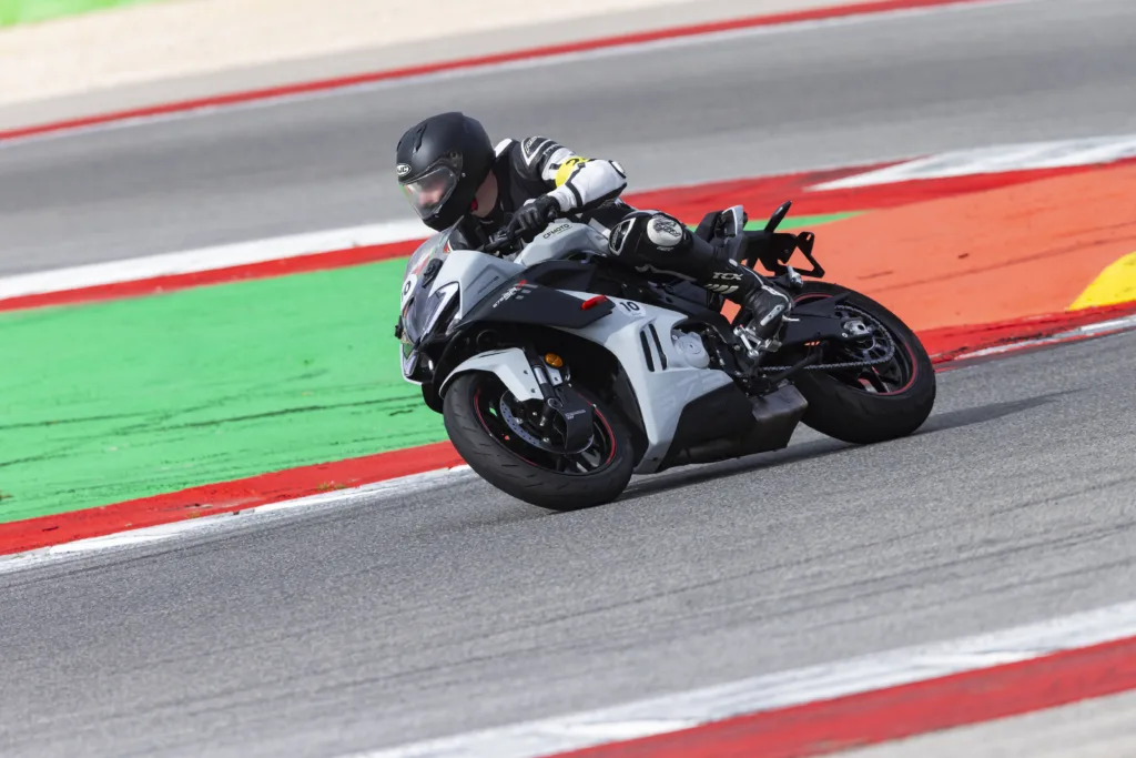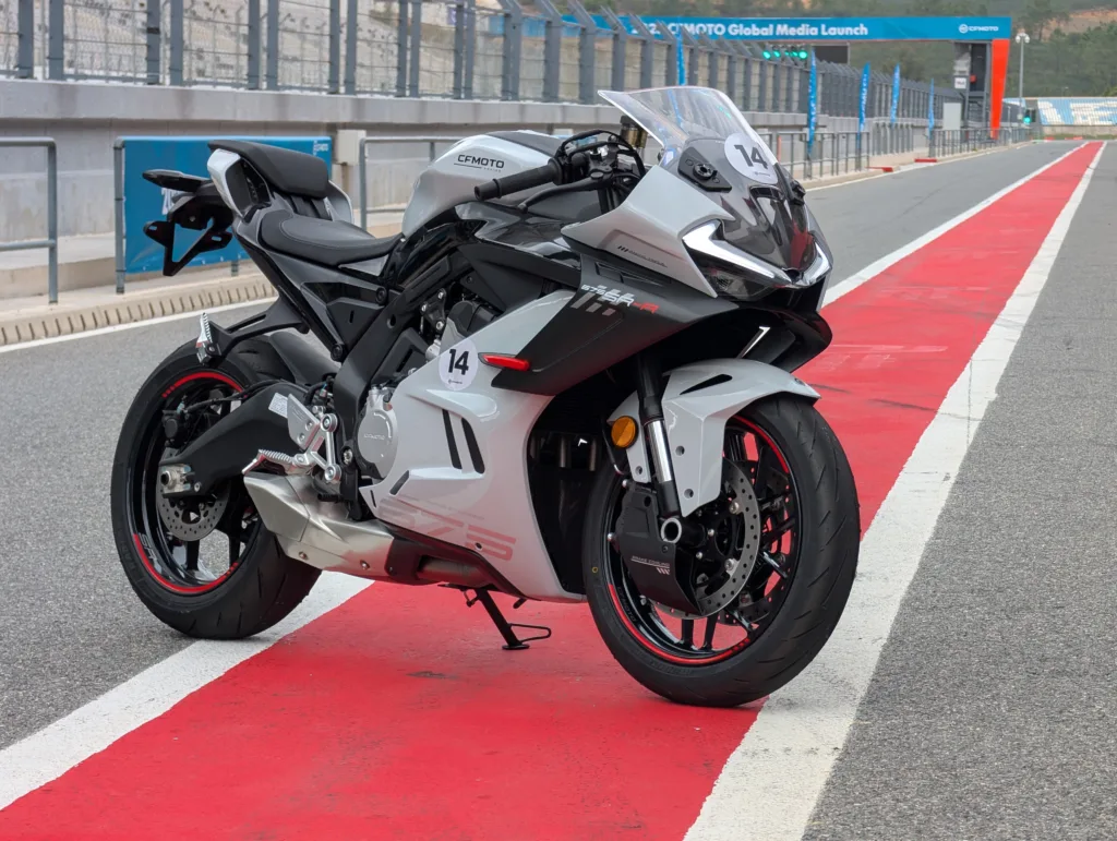 Bet prieš kalbant apie tai, kaip 675SR-R jautėsi šioje nuostabioje trasoje, reikėtų pakalbėti apie šio motociklo išvaizdą. Ir nors aš puikiai suprantu, kad tai labai subjektyvus dalykas, bet mano manymu tai geriausiai atrodantis motociklas iš visos CFMOTO gamos. Ir, netgi, vienas gražiausių motociklų iš visų šiuo metu gaminamų. Jau mažasis šio motociklo brolis 450SR-S atrodė įspūdingai, bet šis su papildomu pločiu tiek variklio srityje, tiek masyvesniuose ratuose atrodo tiesiog fantastiškai.